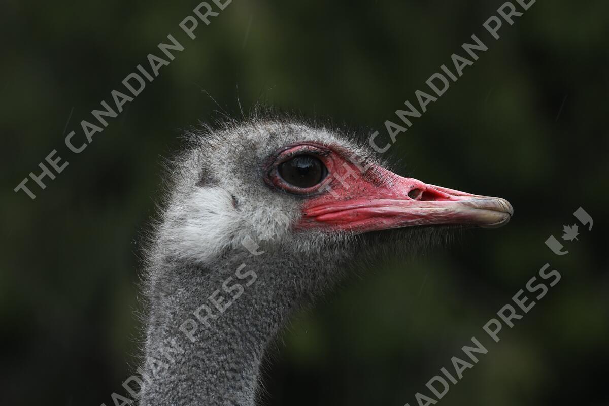 An ostrich at the Universal Ostrich Farms in Edgewood, B.C., on Saturday, May 17, 2025. Hundreds of supporters flocked to the farm over the Victoria long weekend to protest the Canadian Food Inspection Agency’s order to cull 400 ostriches. THE CANADIAN PRESS/Aaron Hemens
