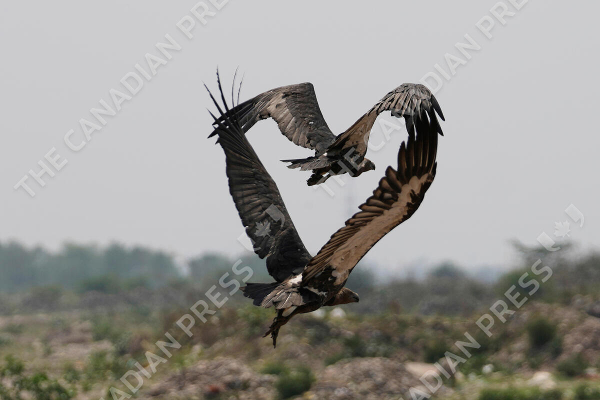 Vultures fly over the decomposed body of an animal, unseen, in Jammu, India, Tuesday, May 27, 2025. (AP Photo/Channi Anand)