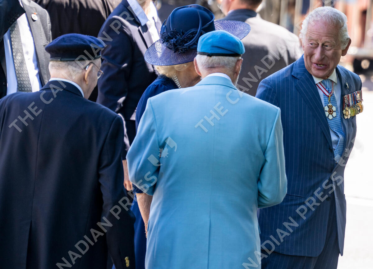King Charles speaks with two veterans prior to the wreath laying ceremony at the National War Memorial in Ottawa on Tuesday, May 27, 2025. THE CANADIAN PRESS/Christinne Muschi
