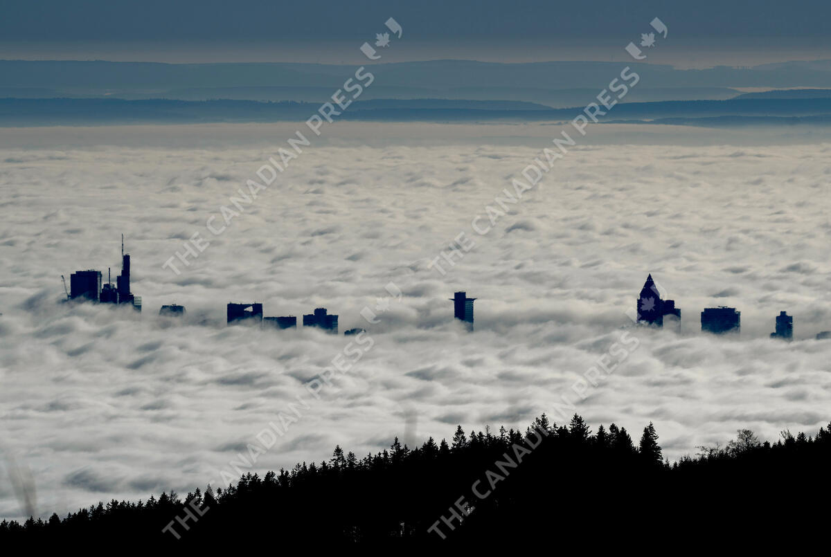 The buildings of the banking district come out of the thick fog over Frankfurt, Germany, Friday, Dec. 27, 2024. (AP Photo/Michael Probst)