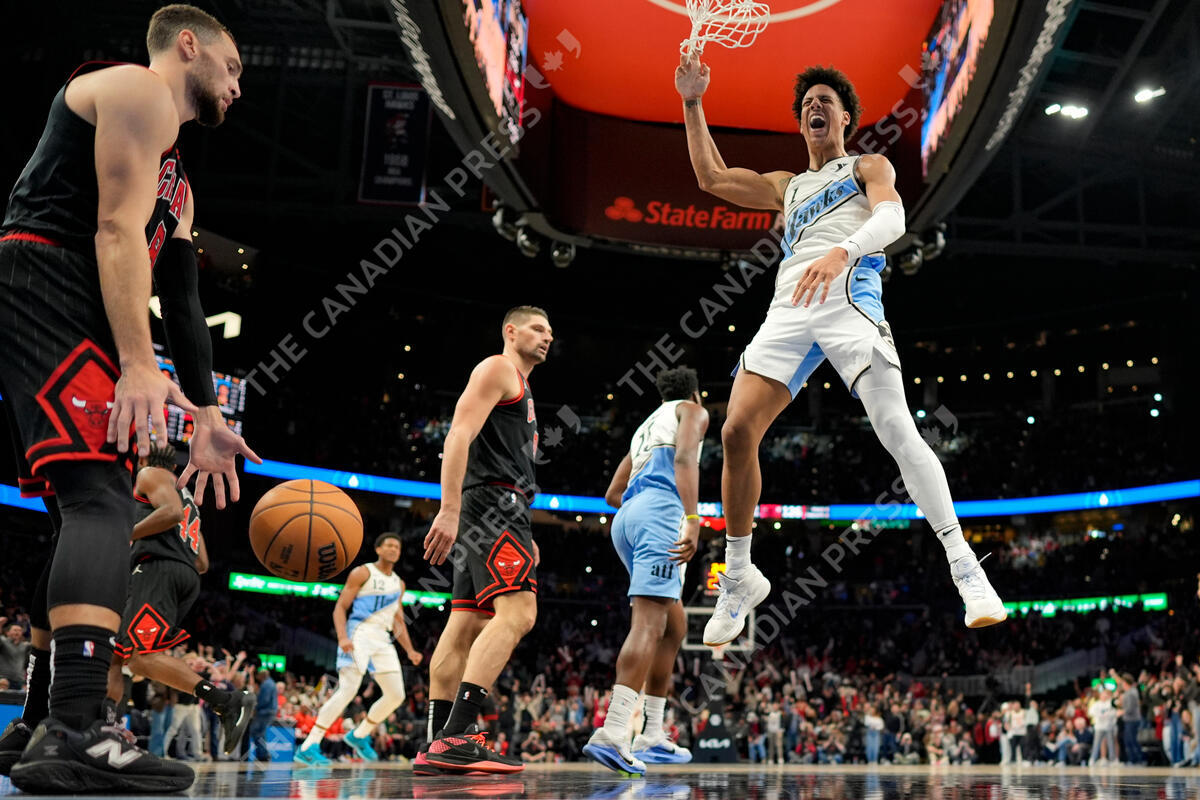 Atlanta Hawks forward Jalen Johnson (1) celebrates after a dunk against against the Chicago Bulls in the closing seconds during the second half of an NBA basketball game Thursday, Dec. 26, 2024, in Atlanta. (AP Photo/Mike Stewart)