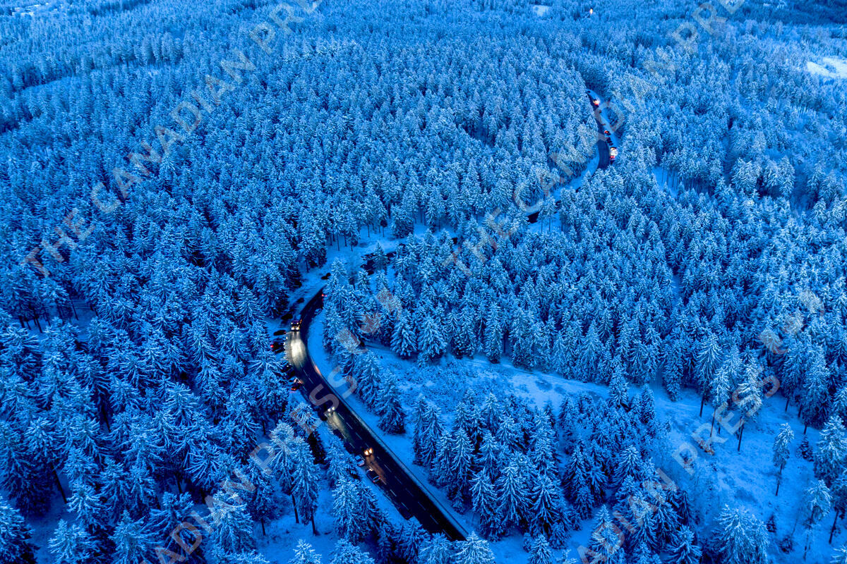 Cars drive up to the top of the Feldberg mountain near Frankfurt, Germany, Thursday evening, Jan. 2, 2025. (AP Photo/Michael Probst)