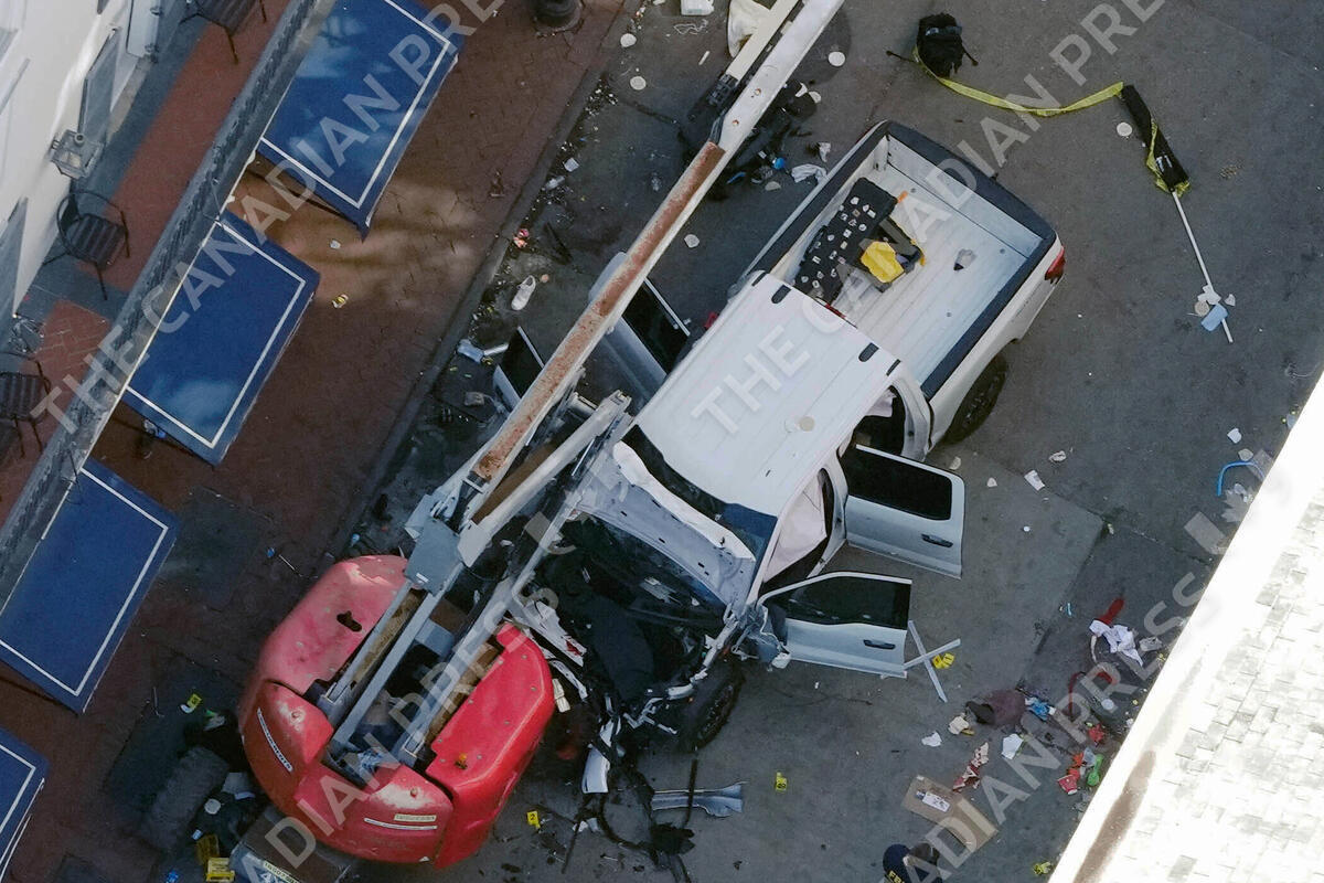 A black flag with white lettering lies on the ground rolled up behind a pickup truck that a man drove into a crowd on Bourbon Street in New Orleans, killing and injuring a number of people, early Wednesday morning, Jan. 1, 2025. The FBI said they recovered an Islamic State group flag, which is black with white lettering, from the vehicle. (AP Photo/Gerald Herbert)