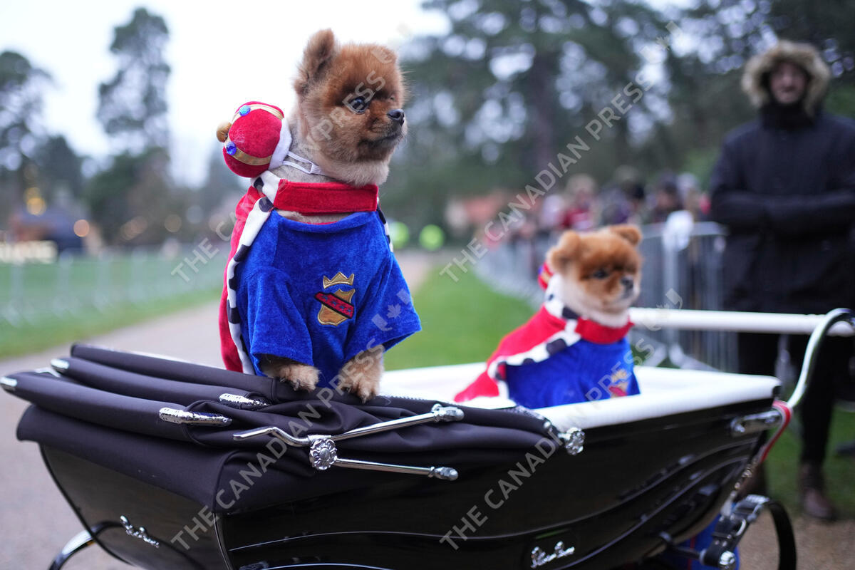 Two Pomeranian dogs in the queue as the public wait to greet members of the British Royal family who will attend the Christmas day service at St Mary Magdalene Church in Sandringham in Norfolk, England, Wednesday, Dec. 25, 2024. (AP Photo/Jon Super)