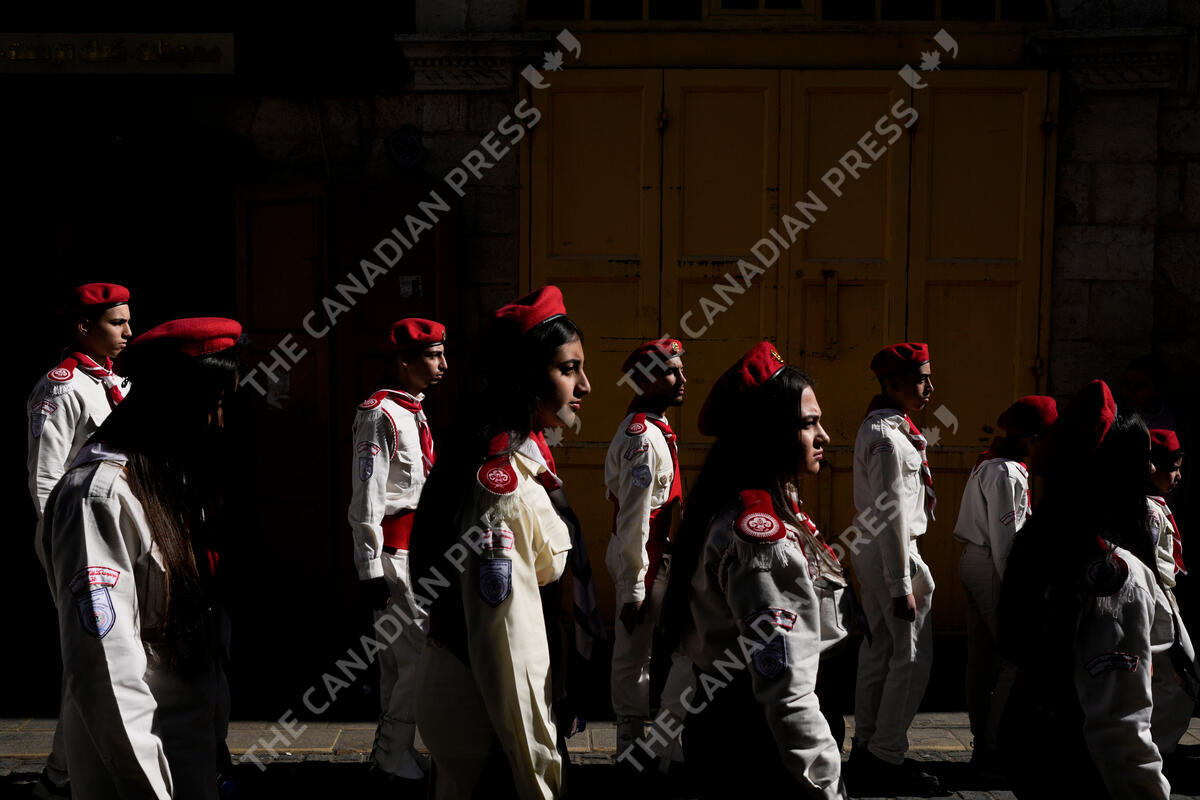 Scouts line up during the traditional Christian procession towards the Church of the Nativity, traditionally believed to be the birthplace of Jesus, on Christmas Eve, in the West Bank city of Bethlehem, Tuesday, Dec. 24, 2024. (AP Photo/Matias Delacroix)