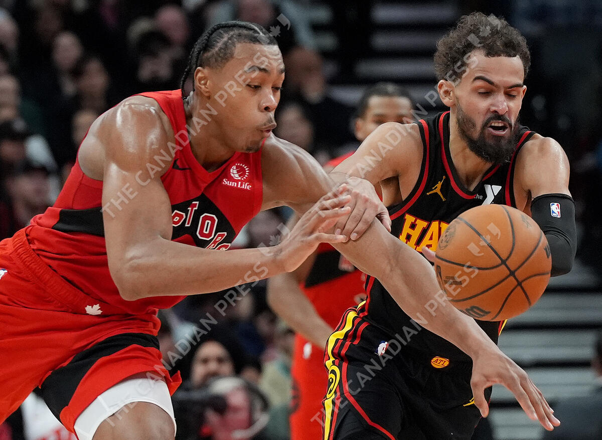 Toronto Raptors forward Scottie Barnes (4) steals the ball from Atlanta Hawks guard Trae Young (11) during second half NBA basketball action in Toronto, Sunday, Dec. 29, 2024. THE CANADIAN PRESS/Frank Gunn