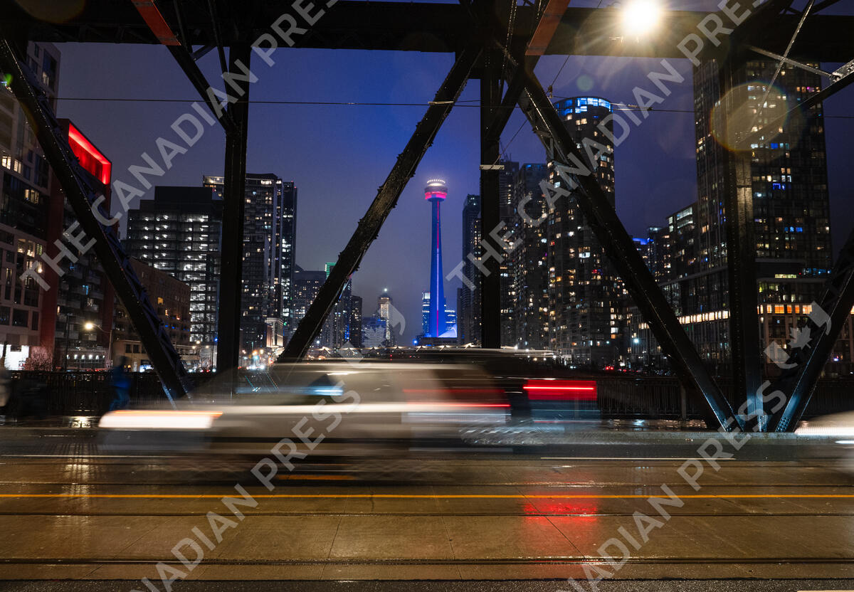 The CN Tower is lit up on a rainy New Year's eve in Toronto on Tuesday, December 31, 2024. THE CANADIAN PRESS/Laura Proctor