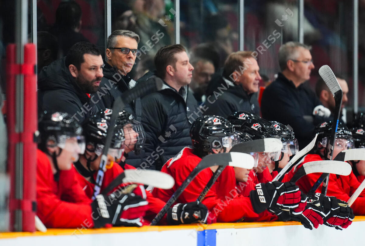 Team Canada Head Coach Dave Cameron, top second from left, stands on the bench with his coaching staff and players during the Canadian World Junior Hockey Championships selection camp scrimmage against U Sports in Ottawa on Thursday, Dec. 12, 2024. THE CANADIAN PRESS/Sean Kilpatrick