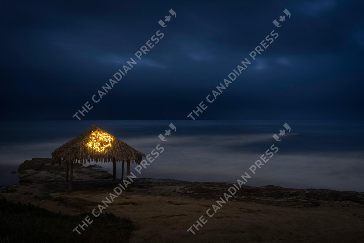 A Christmas wreath and lights adorn the Windansea surf shack along Windansea beach, Thursday, Dec. 12, 2024, in San Diego. (AP Photo/Gregory Bull)