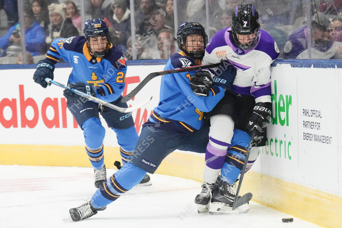 Toronto Sceptres' Renata Fast (14) battles on the boards with Minnesota Frost's Claire Butorac (7) during first period PWHL hockey action on Saturday, December 7, 2024.THE CANADIAN PRESS/Chris Young