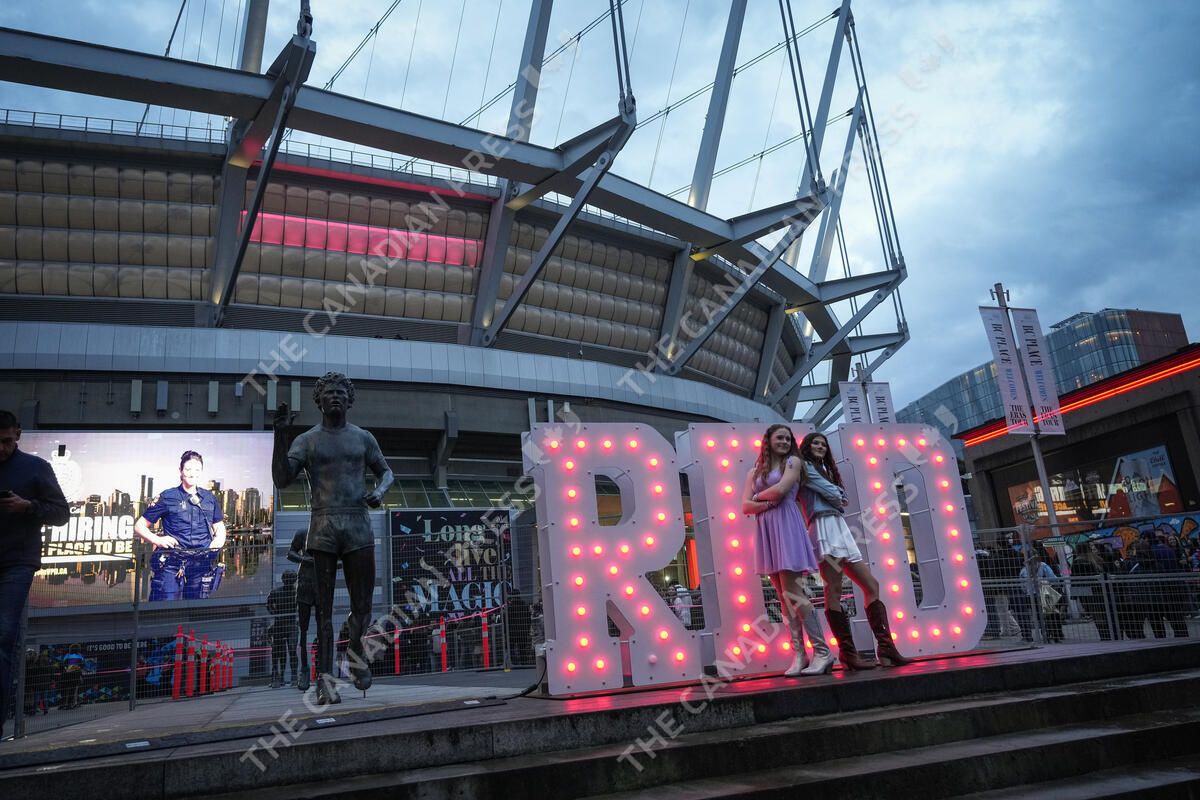 Fans pose in front of a sign outside B.C. Place stadium before the opening night of the Taylor Swift Eras Tour concert, in Vancouver, on Friday, December 6, 2024. THE CANADIAN PRESS/Darryl Dyck
