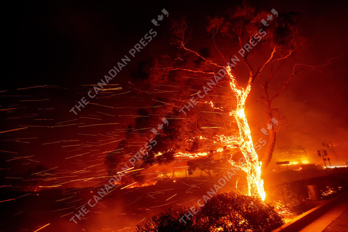 Embers fly as the Franklin Fire burns in Malibu, Calif., on Tuesday, Dec. 10, 2024. (AP Photo/Ethan Swope)