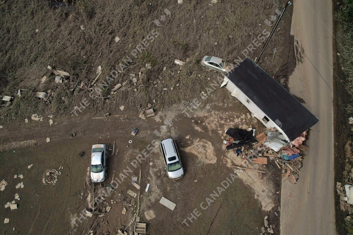 A destroyed mobile home and vehicles lay scattered across muddy land, Tuesday, Oct. 1, 2024, in Hendersonville, N.C., in the aftermath of Hurricane Helene. (AP Photo/Brittany Peterson)