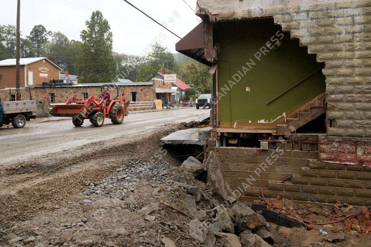 A person driving a front in loader passes a heavily one of several heavily damaged buildings along Bridge Street as clean up begins in the aftermath of Hurricane Helene Tuesday, Oct. 1, 2024, in Hot Springs, N.C. (AP Photo/Jeff Roberson)