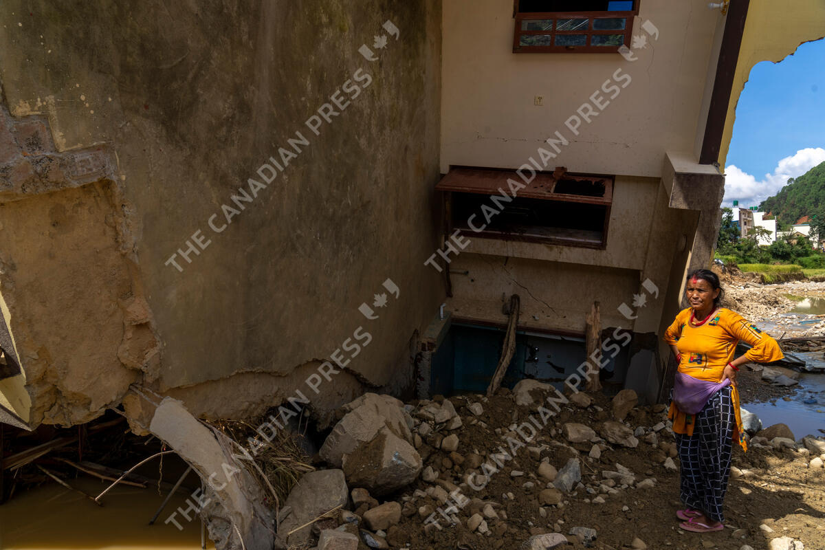 Sharmila Khadka, 50, looks at her house damaged in the floods caused by heavy rains in Lalitpur, Nepal, on Tuesday, Oct. 1, 2024. (AP Photo/Niranjan Shrestha)