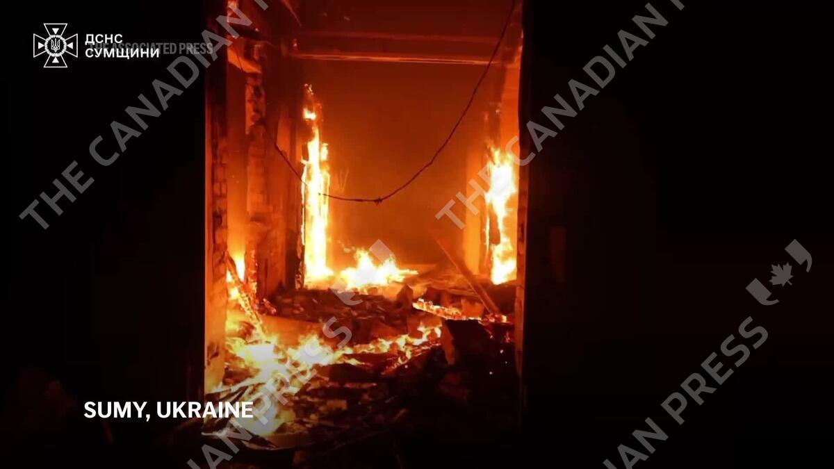 Firefighters tackle flames as Ukrainian officials say Russian strikes hit Mykolaiv and Sumy