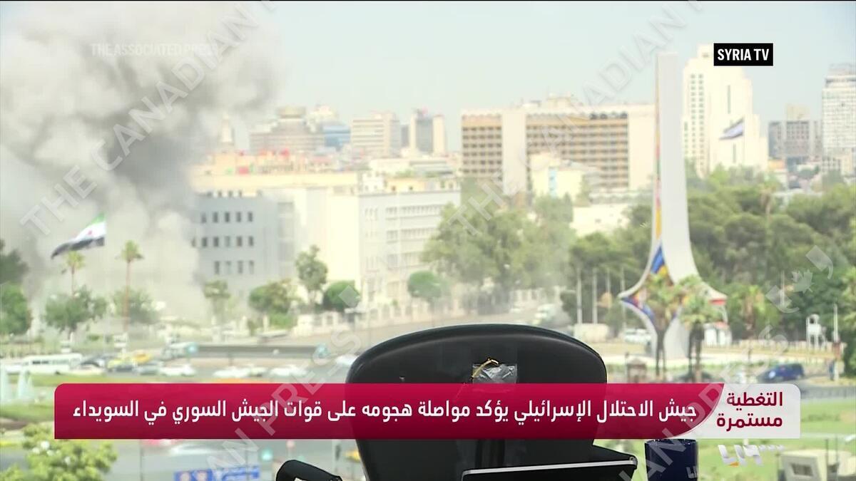 Syria TV has released footage of the moment its Damascus studio captured an Israeli strike on the Syrian Defense Ministry. A news presenter for the channel ran for cover on Wednesday, after Israel launched an attack on the government building behind the news studio as she was doing a live broadcast. Israel said the strike was part of a campaign to protect Syria's Druze religious minority.