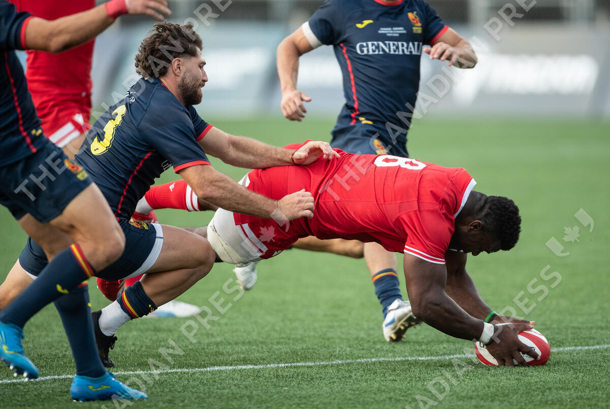 Canada's Matthew Oworu (8) scores a try as Spain's Joaquin Dominguez (3) tries to tackle during second half men's rugby action in Edmonton, on Friday July 18, 2025. THE CANADIAN PRESS/Jason Franson