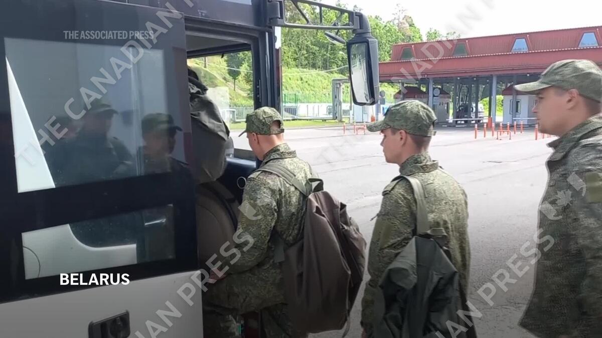 The Ministry released video of soldiers boarding a bus from an undisclosed location in Belarus.