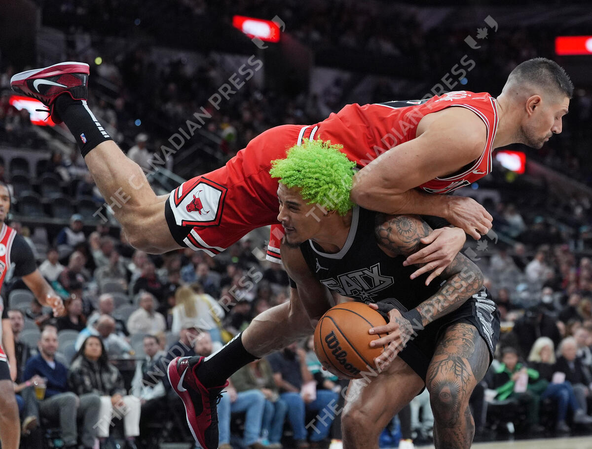 San Antonio Spurs forward Jeremy Sochan, bottom is fouled by Chicago Bulls center Nikola Vucevic, top, as he drives to the basket during the first half of an NBA basketball game in San Antonio, Thursday, Dec. 5, 2024. (AP Photo/Eric Gay)
