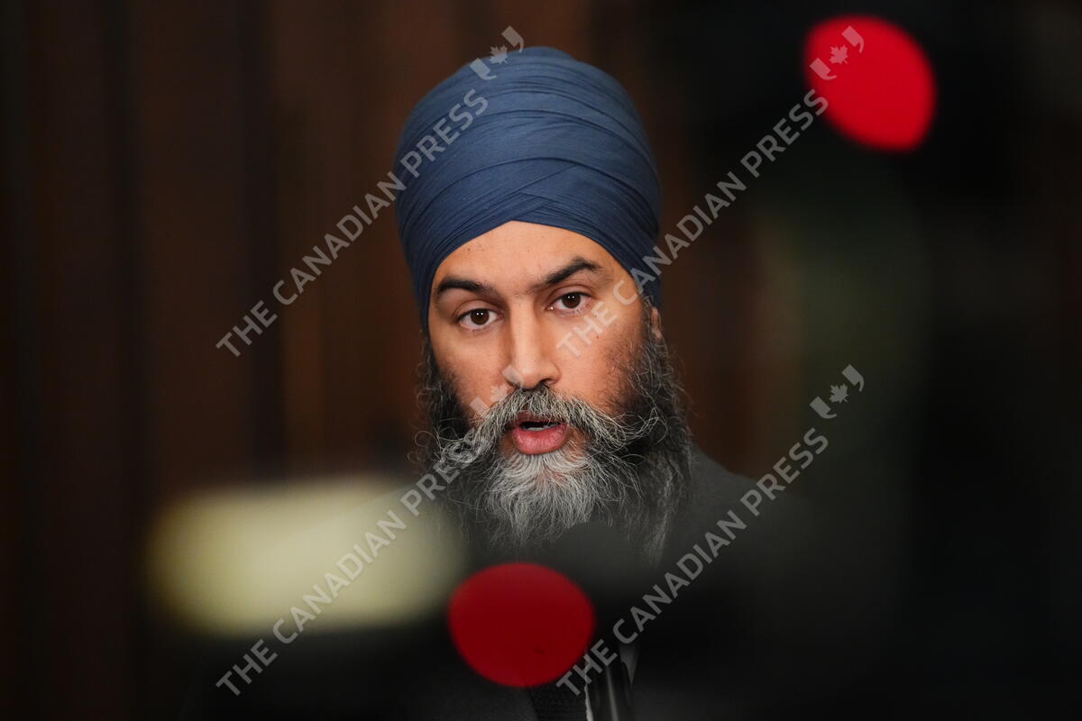 NDP Leader Jagmeet Singh talks to media in the foyer outside the House of Commons prior to Question Period in Ottawa on Wednesday, Dec.4, 2024. THE CANADIAN PRESS/Sean Kilpatrick