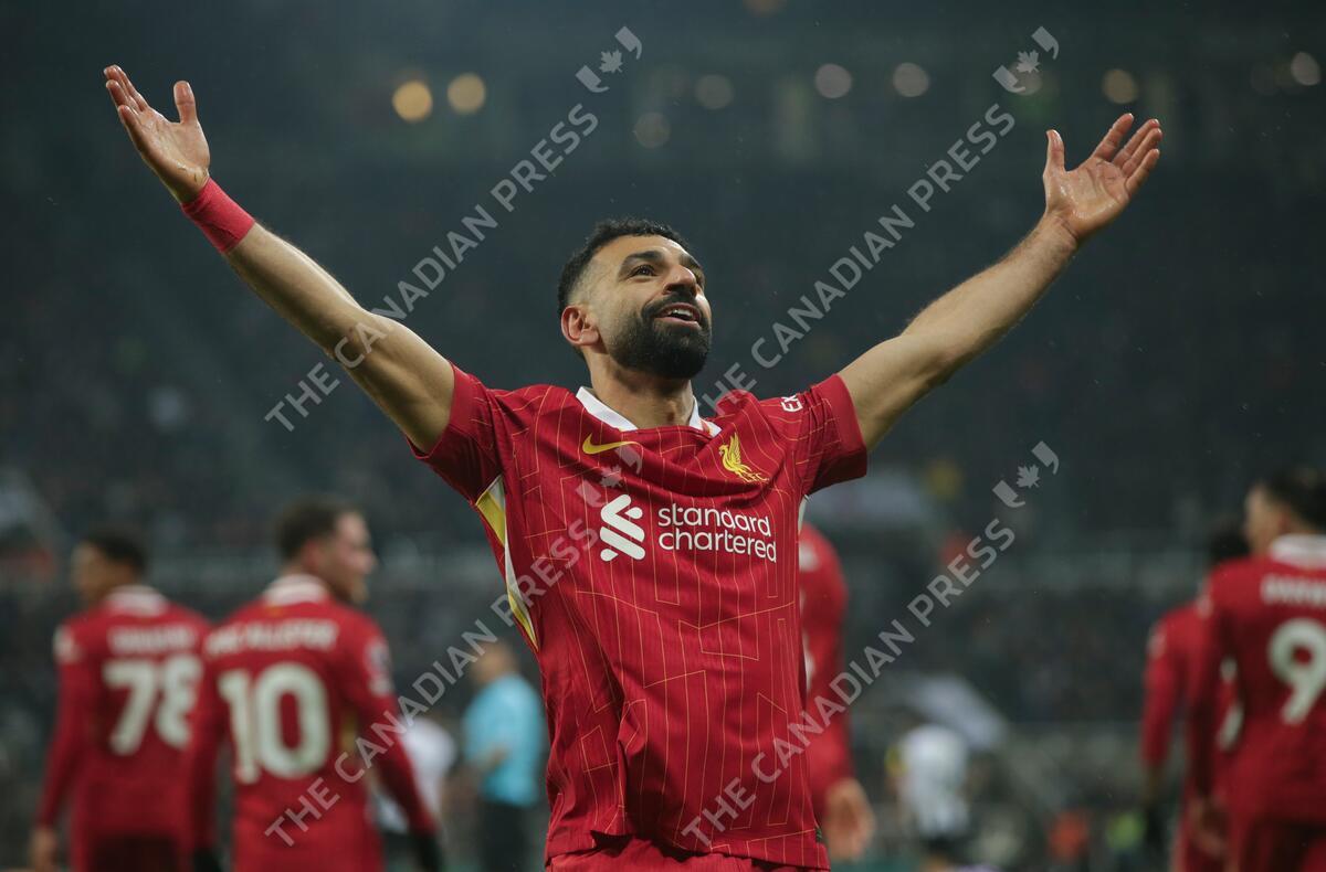 Liverpool's Mohamed Salah celebrates after scoring his side's third goal during the English Premier League soccer match between Newcastle and Liverpool, at St. James Park in Newcastle, England, Wednesday, Dec 4, 2024. (AP Photo/Ian Hodgson)