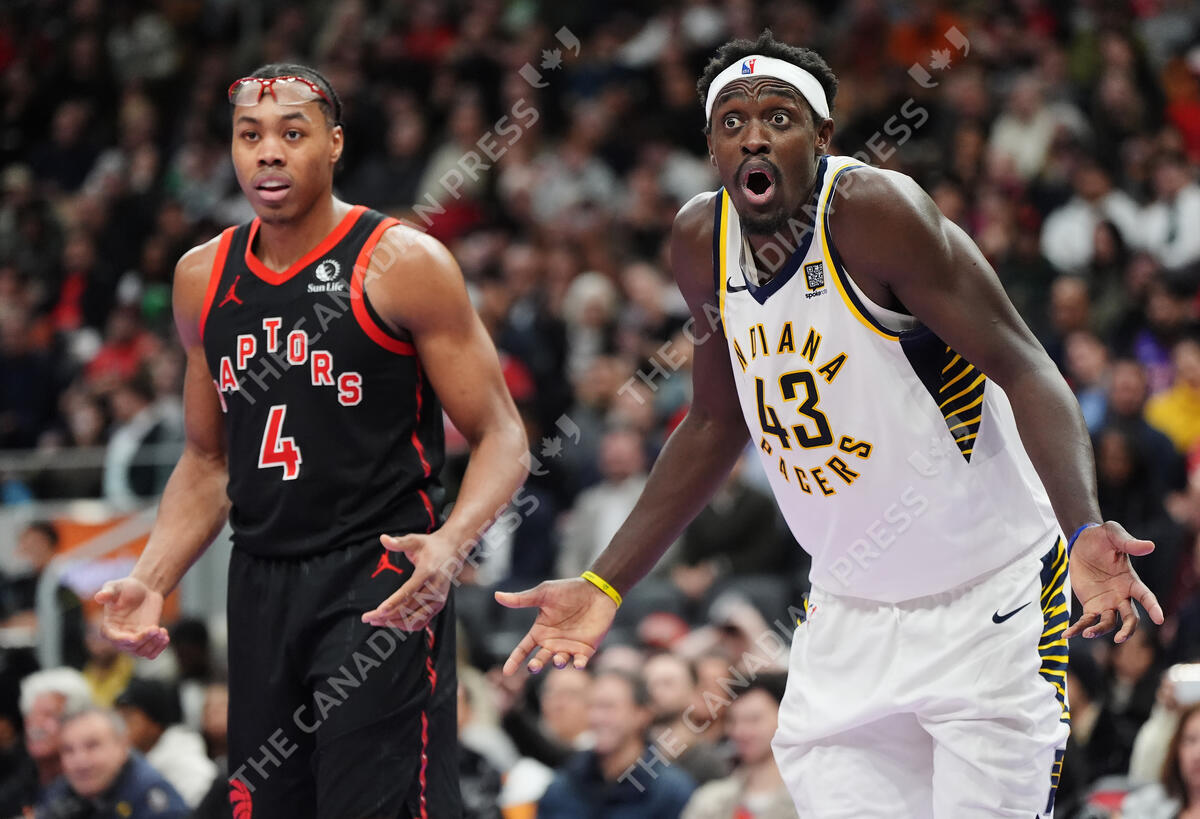 Indiana Pacers' Pascal Siakam (43) reacts to a foul call as Toronto Raptors' Scottie Barnes (4) looks on during second half NBA basketball action in Toronto on Tuesday, December 3, 2024. THE CANADIAN PRESS/Frank Gunn