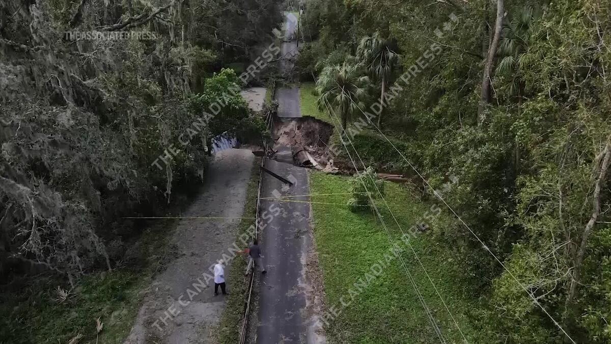 A small bridge over a creek washed out during Hurricane Milton, blocking the only access point into a community in Riverview, Florida. (AP video: Julio Cortez)