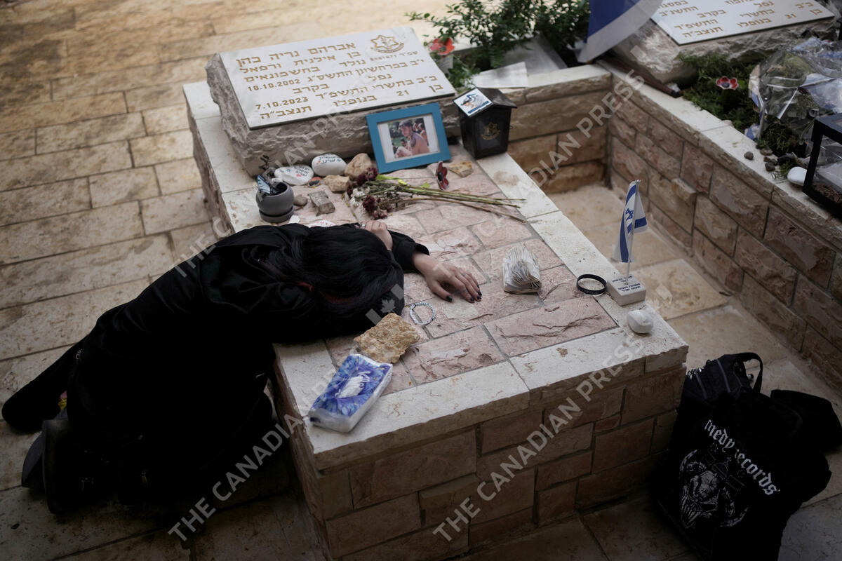 Sara Chen weeps over the grave of her longtime friend, Staff Sergeant Avraham Nerya Cohen, who was killed in action on 7 October. 2023, as Israel marks the one-year anniversary of the Hamas attack on Israel, at the Mount Herzl military cemetery in Jerusalem on Monday, 7 October 2024. (AP Photo/Maya Alleruzzo)