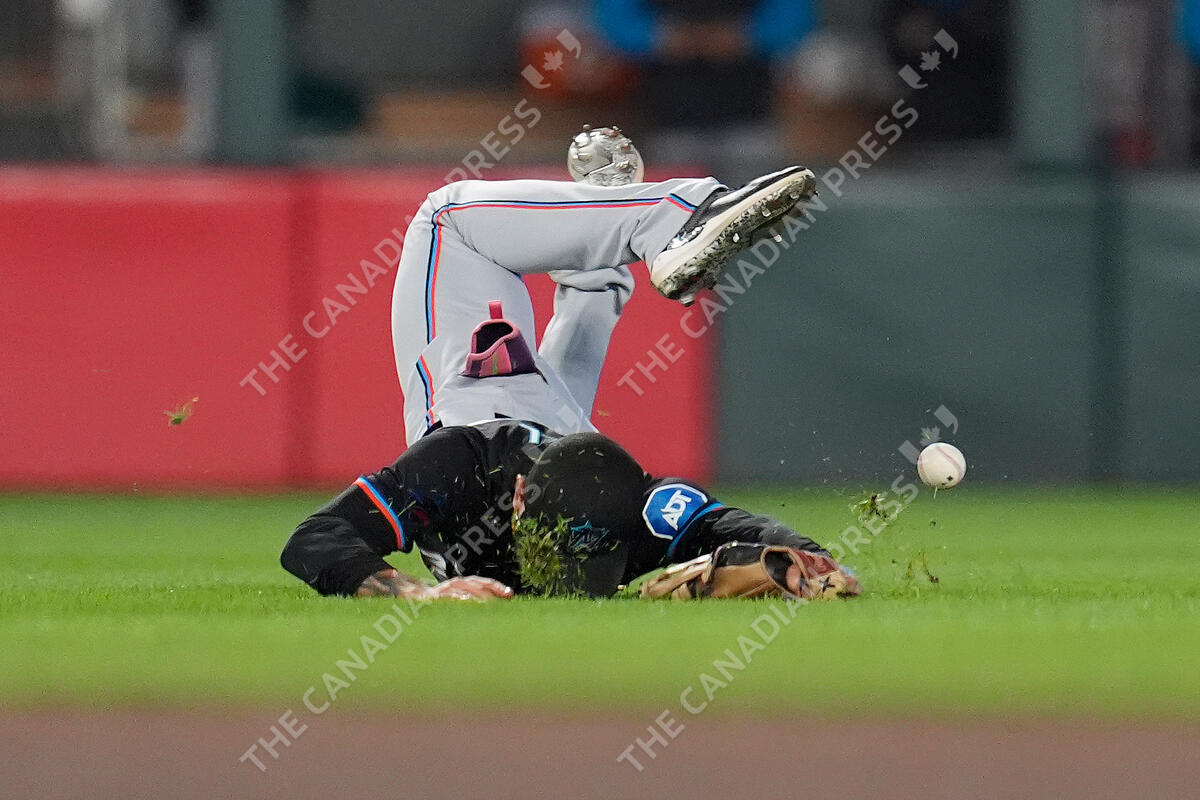 Miami Marlins center fielder Derek Hill falls after failing to catch a single hit by Minnesota Twins' Ryan Jeffers during the seventh inning of a baseball game Thursday, Sept. 26, 2024, in Minneapolis. (AP Photo/Abbie Parr)