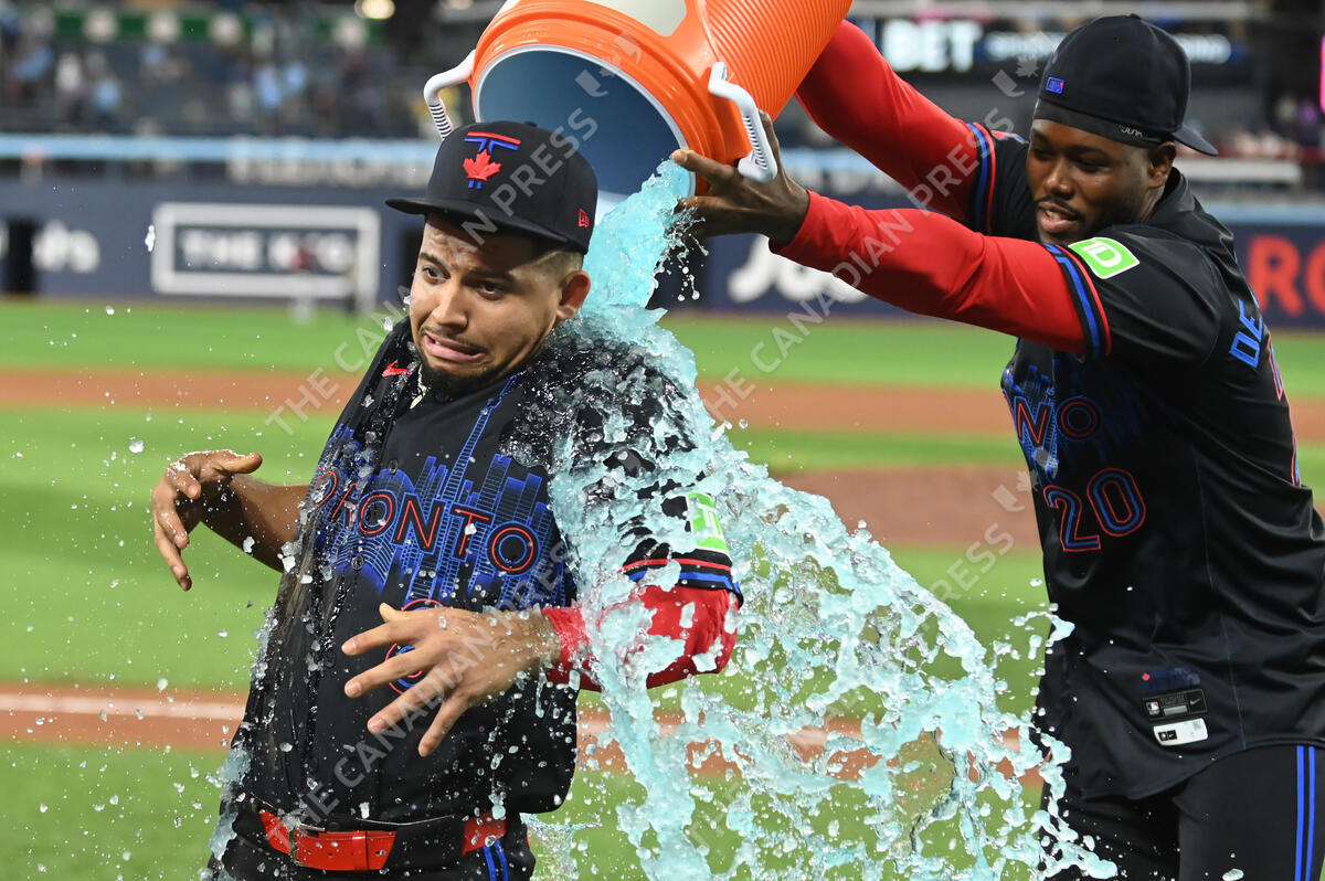 Toronto Blue Jays' Jonatan Clase, left, is doused by teammate Luis De Los Santos following their victory over the Boston Red Sox in an MLB baseball game in Toronto on Wednesday Sept. 25, 2024. THE CANADIAN PRESS/Jon Blacker