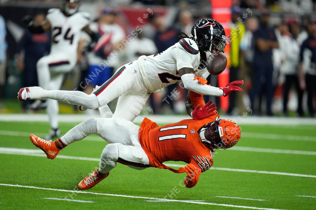 Chicago Bears wide receiver DeAndre Carter (11) collides with Houston Texans safety Calen Bullock while attempting to catch a pass during the first half of an NFL football game Sunday, Sept. 15, 2024, in Houston. Bullock was flagged for defensive pass interference on the play. (AP Photo/Eric Christian Smith)
