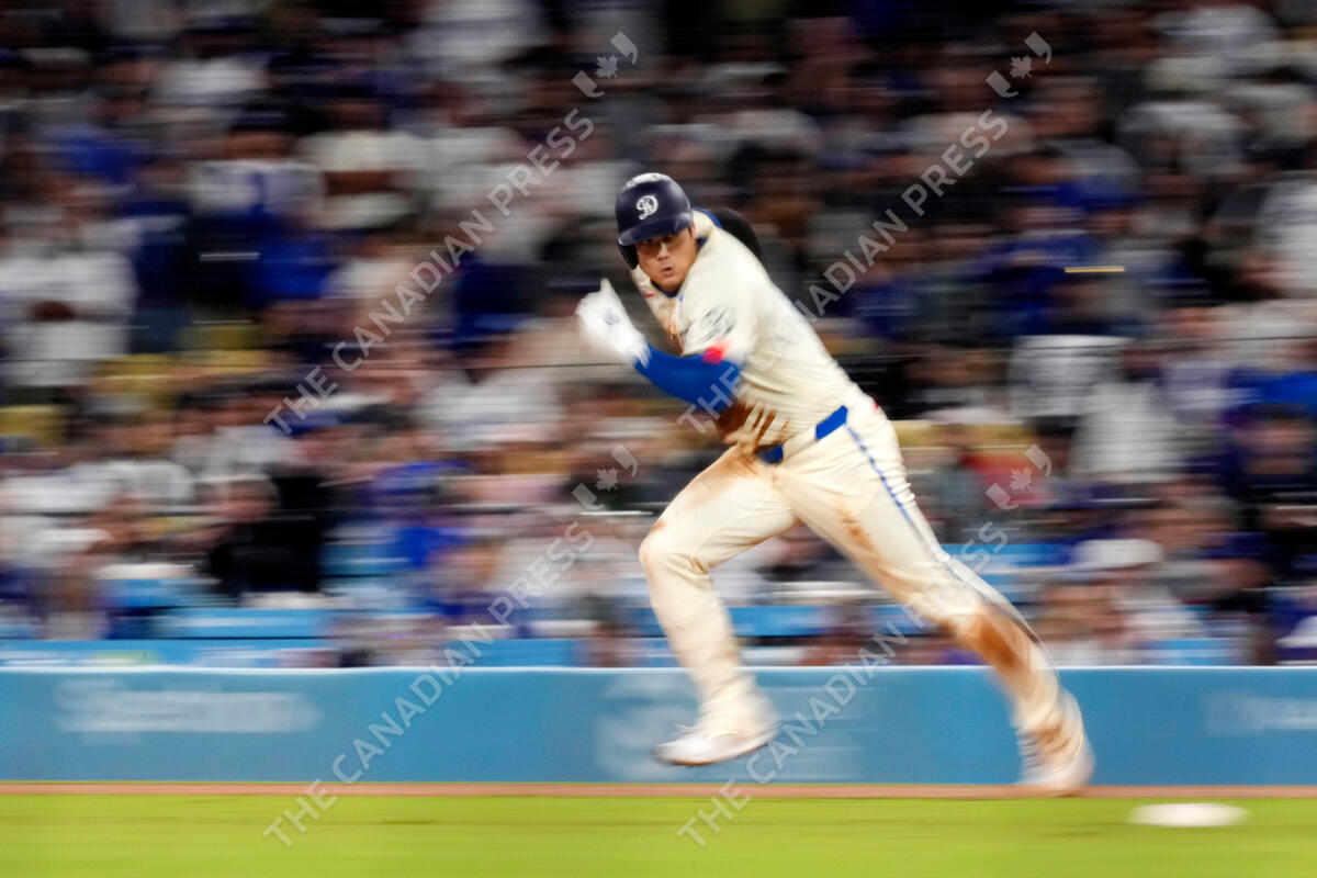 Los Angeles Dodgers' Shohei Ohtani runs from first on his way to stealing second during the ninth inning of a baseball game against the Colorado Rockies, Saturday, Sept. 21, 2024, in Los Angeles. (AP Photo/Mark J. Terrill)