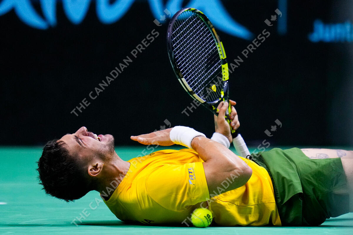 Australia's Athanasios Kokkinakis celebrates after winning against Ben Shelton of the United States during a Davis Cup quarterfinal match at the Martin Carpena Sports Hall, in Malaga, southern Spain, on Thursday, Nov. 21, 2024. (AP Photo/Manu Fernandez)