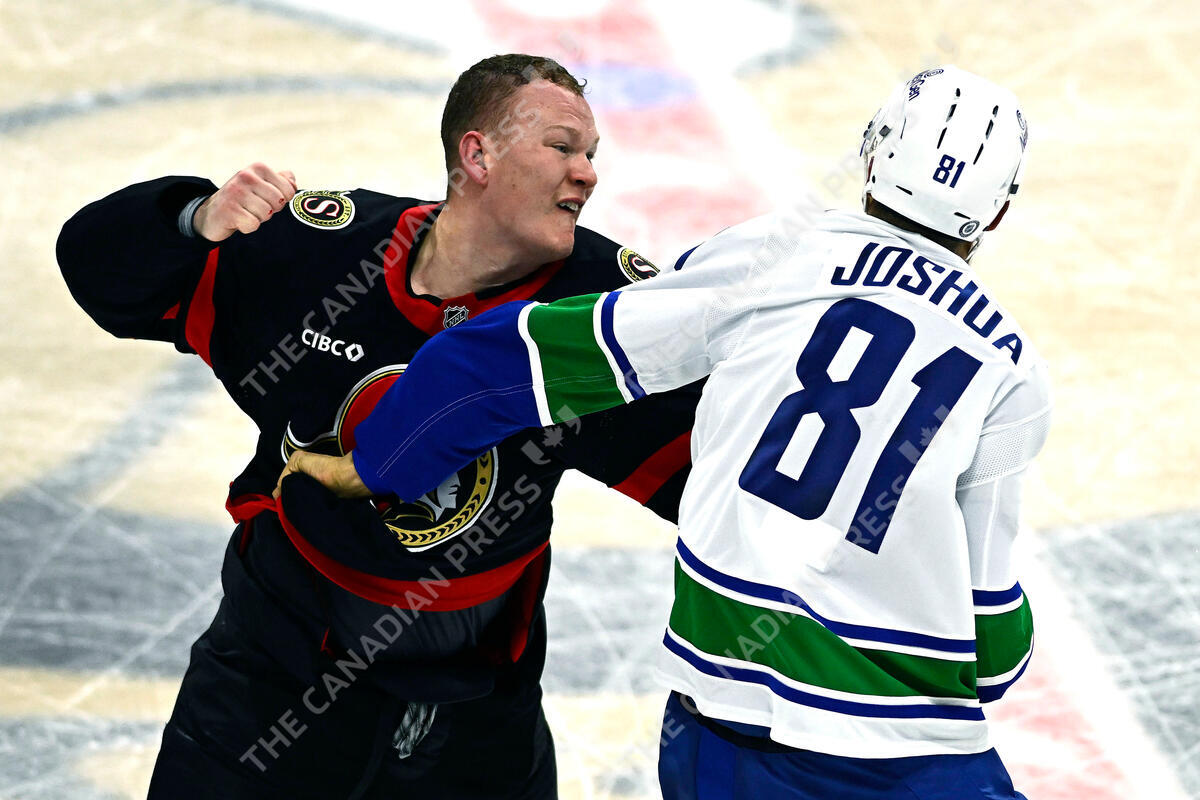 Ottawa Senators left wing Brady Tkachuk (7) fights with Vancouver Canucks centre Dakota Joshua (81) during third period NHL hockey action in Ottawa, on Saturday, Nov. 23, 2024. THE CANADIAN PRESS/Justin Tang