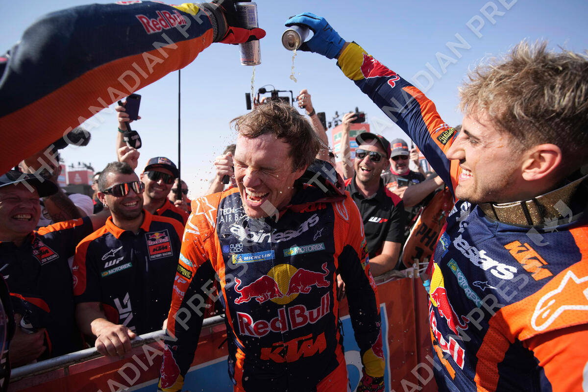 Rider Daniel Sanders of Australia celebrates winning the Dakar Rally after the twelfth stage in Shubaytah, Saudi Arabia, Friday, Jan. 17, 2025. (AP Photo/Christophe Ena)