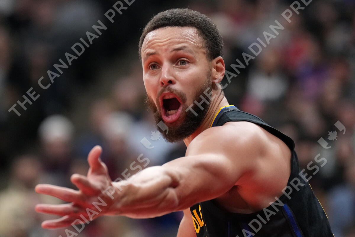 Golden State Warriors guard Stephen Curry (30) reacts to a call during first half NBA basketball action against the Toronto Raptors, in Toronto, Monday, Jan. 13, 2025. THE CANADIAN PRESS/Nathan Denette
