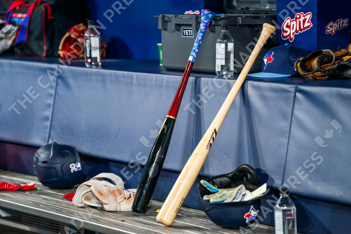 A bat with a wider barrel sometimes referred to as a torpedo bat sits next to a normal bat during the first inning of MLB baseball action against the Washington Nationals, in Toronto, Monday, March 31, 2025. THE CANADIAN PRESS/Thomas Skrlj