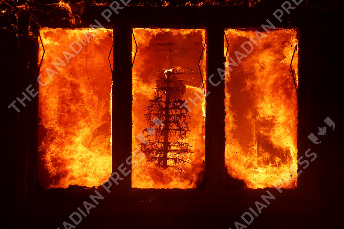 The Palisades Fire burns a Christmas tree inside a residence in the Pacific Palisades neighborhood of Los Angeles, Tuesday, Jan. 7, 2025. (AP Photo/Ethan Swope)