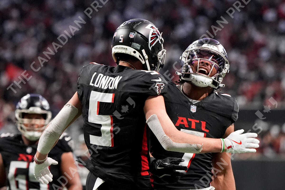 Atlanta Falcons wide receiver Drake London celebrates after scoring with running back Bijan Robinson against the Carolina Panthers during the second half of an NFL football game, Sunday, Jan. 5, 2025, in Atlanta. (AP Photo/Mike Stewart)