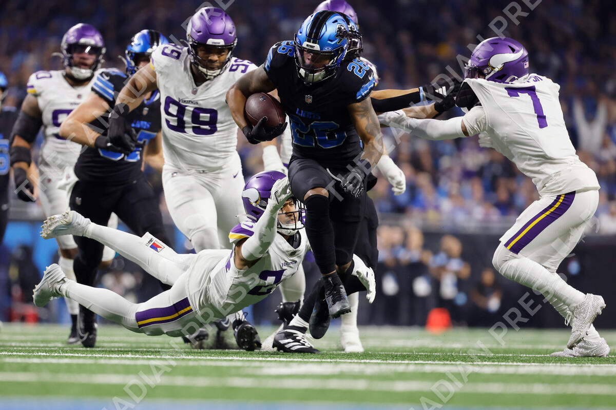 Detroit Lions running back Jahmyr Gibbs (26) runs for a touchdown against the Minnesota Vikings during the first half of an NFL football game Sunday, Jan. 5, 2025, in Detroit. (AP Photo/Rey Del Rio)