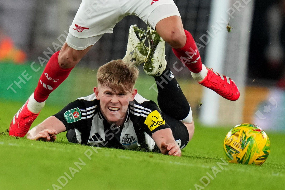 Newcastle's Lewis Hall, left, falls as he fights for the ball with Arsenal's Leandro Trossard during the English League Cup semifinal first leg soccer match between Arsenal and Newcastle United at the Emirates stadium in London, Tuesday, Jan. 7, 2025. (AP Photo/Kirsty Wigglesworth)