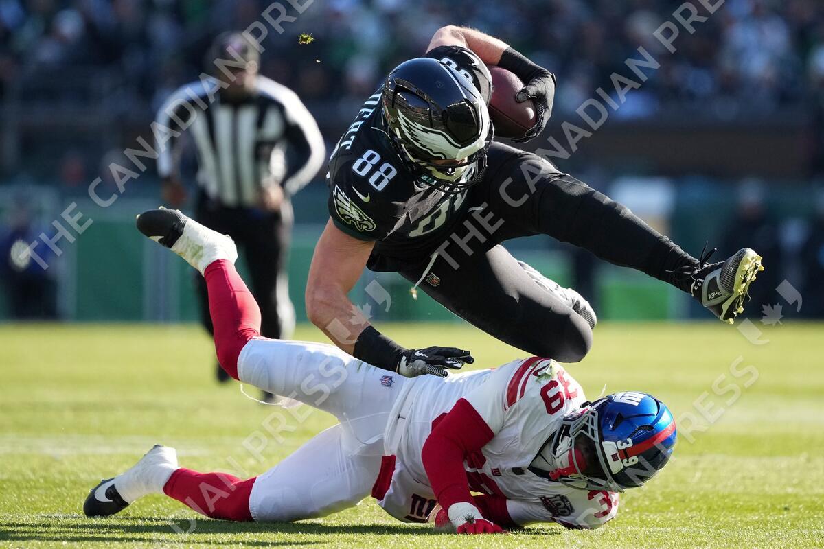 Philadelphia Eagles tight end Dallas Goedert (88) is tackled by New York Giants cornerback Divaad Wilson (39) after a catch during the first half of an NFL football game Sunday, Jan. 5, 2025, in Philadelphia. (AP Photo/Matt Slocum)