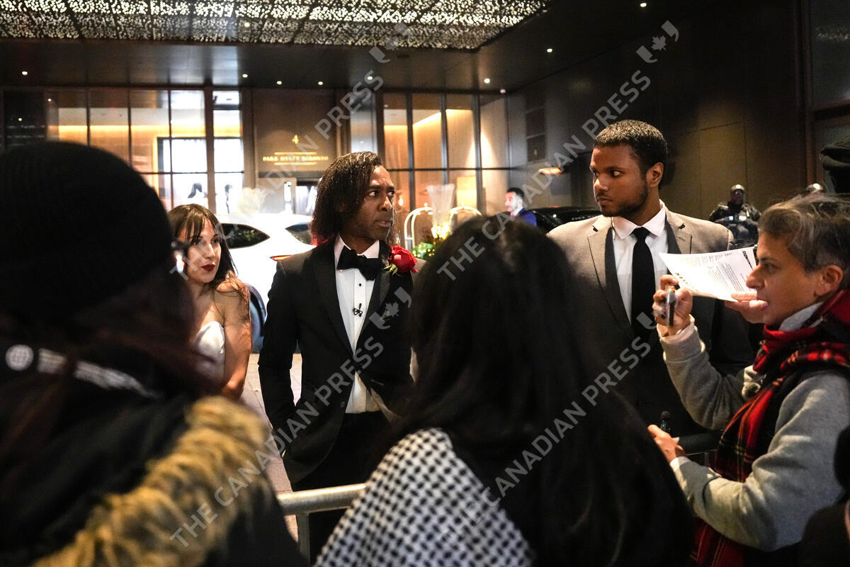 Former Giller Prize winner Ian Williams, second from left, speaks to protesters, as they demonstrate outside the venue where the Giller Prize award ceremony is taking place, in Toronto, Monday, Nov. 18, 2024. THE CANADIAN PRESS/Chris Young