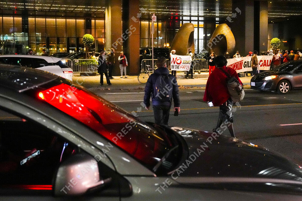 Guests arrive as protesters form a picket line outside the venue where the Giller Prize award ceremony is taking place, in Toronto, Monday, Nov. 18, 2024. THE CANADIAN PRESS/Chris Young
