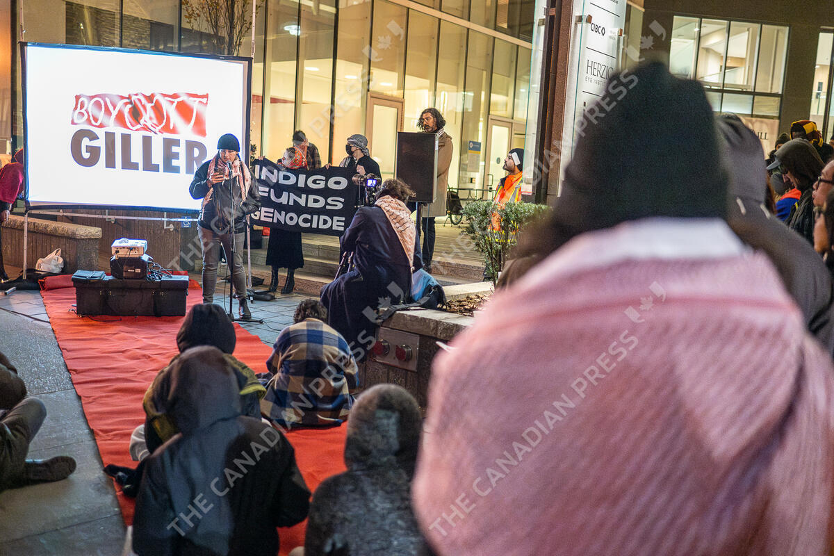 Demonstrators gather in front of a downtown Toronto hotel on Monday afternoon as the Giller Award ceremony was about to begin, chanting "free Palestine" and holding banners, in Toronto, Monday, Nov. 18, 2024. THE CANADIAN PRESS/Eduardo Lima