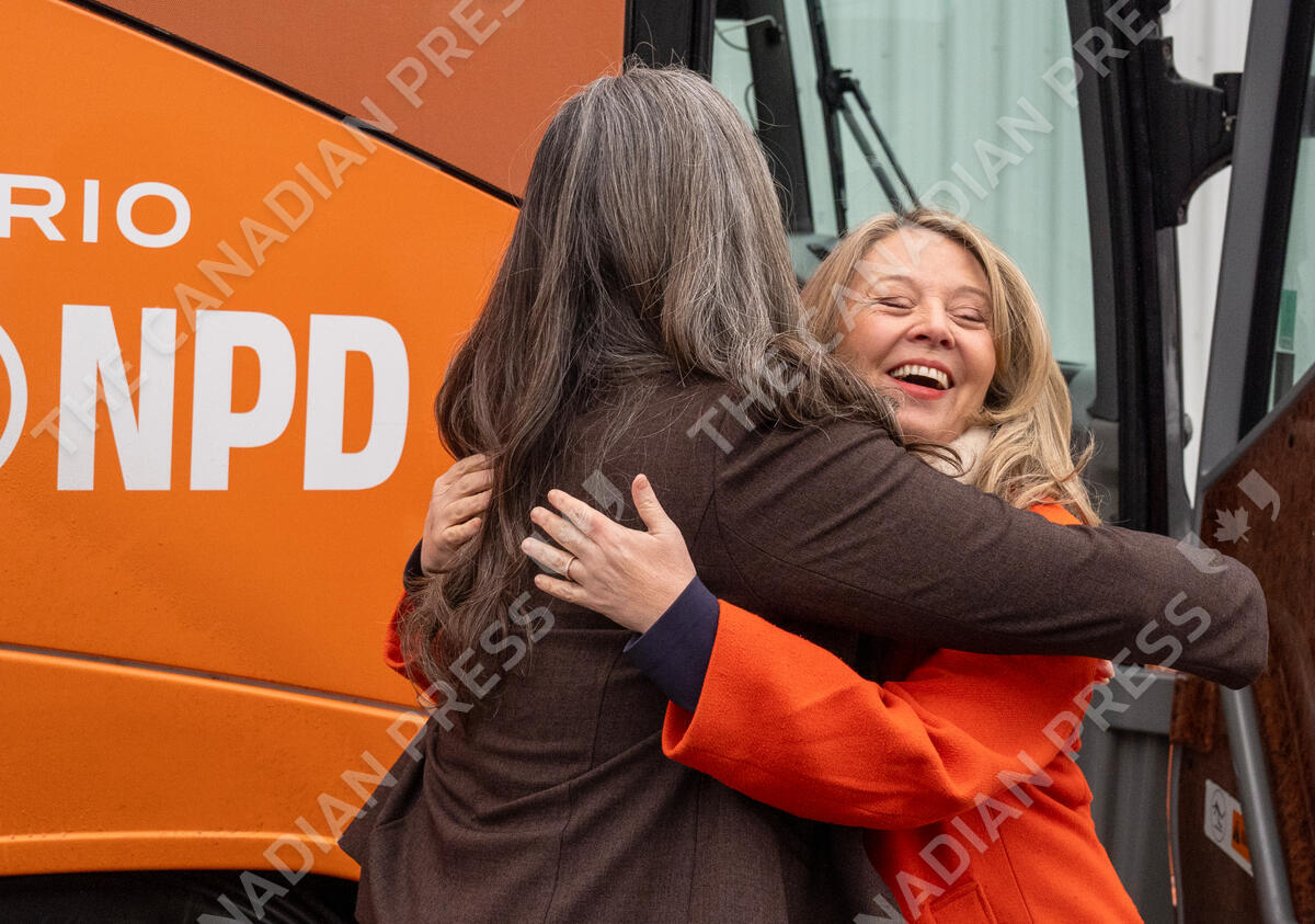 Ontario NDP Leader Marit Stiles (right) is greeted by candidate Jennifer French at a campaign event in Oshawa, Ont. on Monday, Feb. 3, 2025. THE CANADIAN PRESS/Frank Gunn