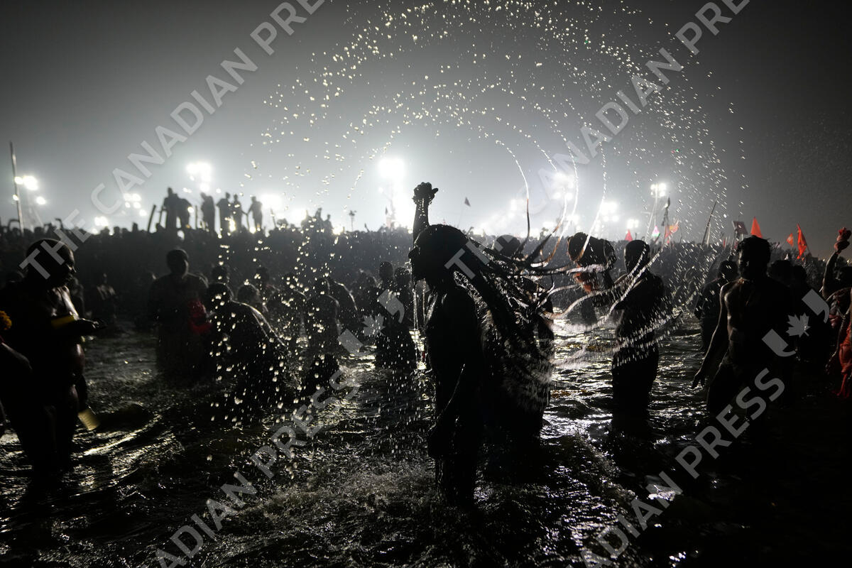 Naga Sadhus or Naked Hindu holy men take dips at Sangam, the confluence of three sacred rivers the Yamuna, the Ganges and the mythical Saraswati, on Vasant Panchami during the Kumbh Mela in Prayagraj, Uttar Pradesh state, India, Monday, Feb. 3, 2025.(AP Photo/Channi Anand)