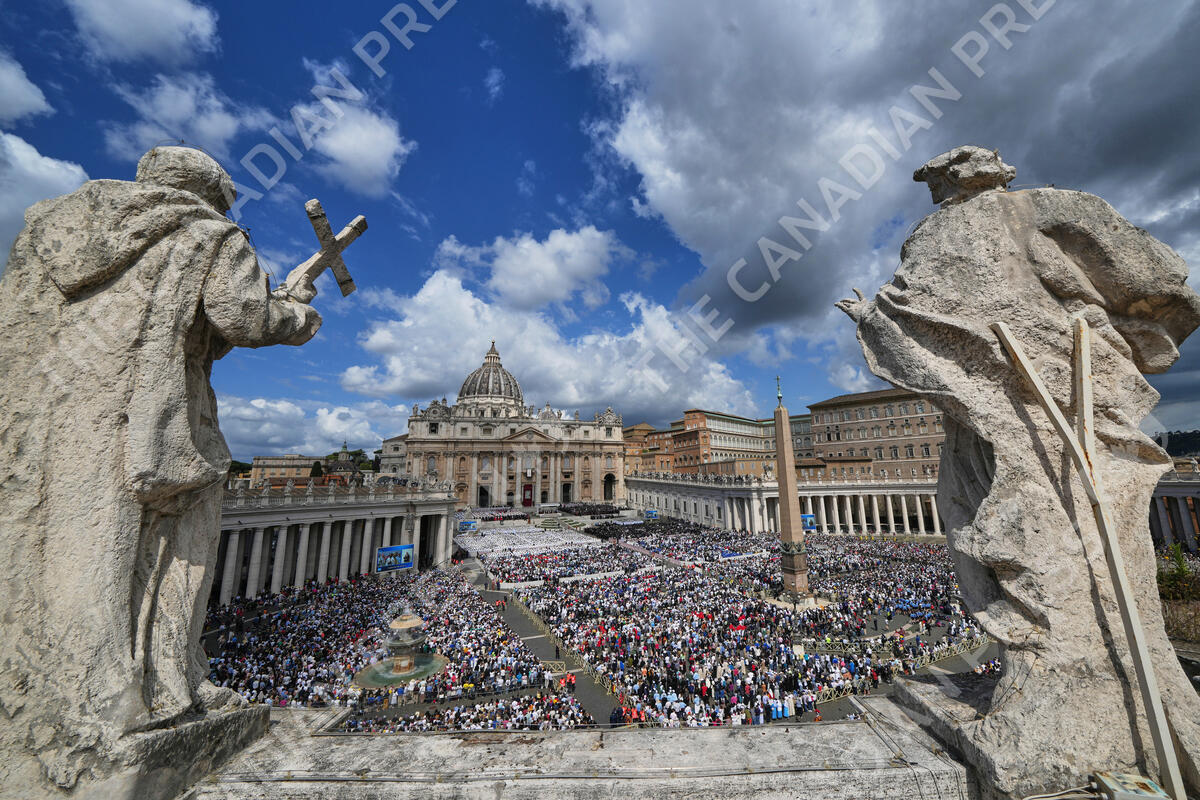 Faithful gather as Pope Leo XIV celebrates a Mass for the formal inauguration of his pontificate, in St. Peter's Square at the Vatican, Sunday, May 18, 2025. (AP Photo/Domenico Stinellis)