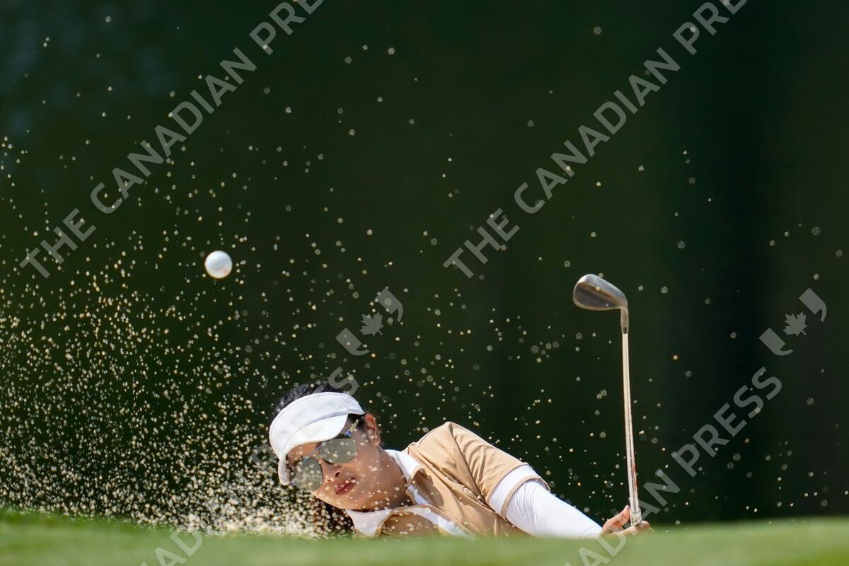 Peiyun Chien, of Taiwan, hits from a bunker on the 17th hole during the third round of the Chevron Championship LPGA golf tournament Saturday, April 26, 2025, in The Woodlands, Texas. (AP Photo/Ashley Landis)